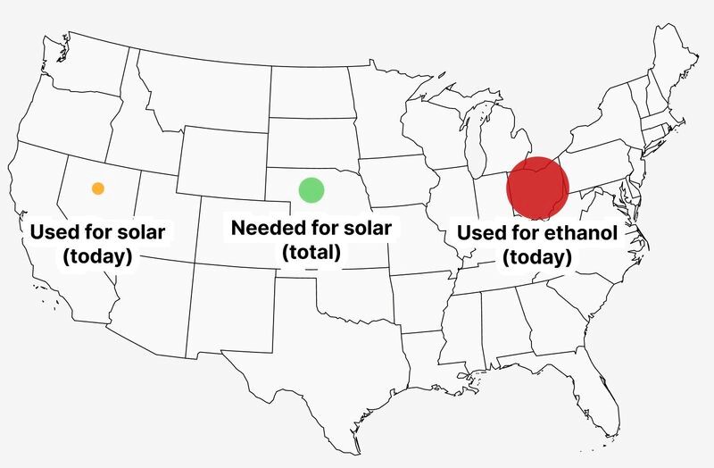 Check out the map, below. The small yellow circle is how much U.S. land mass is currently used for solar; the green one is how much land mass needed to power the entire country on photovoltaics; and the red circle is how much is currently being used for ethanol production today.